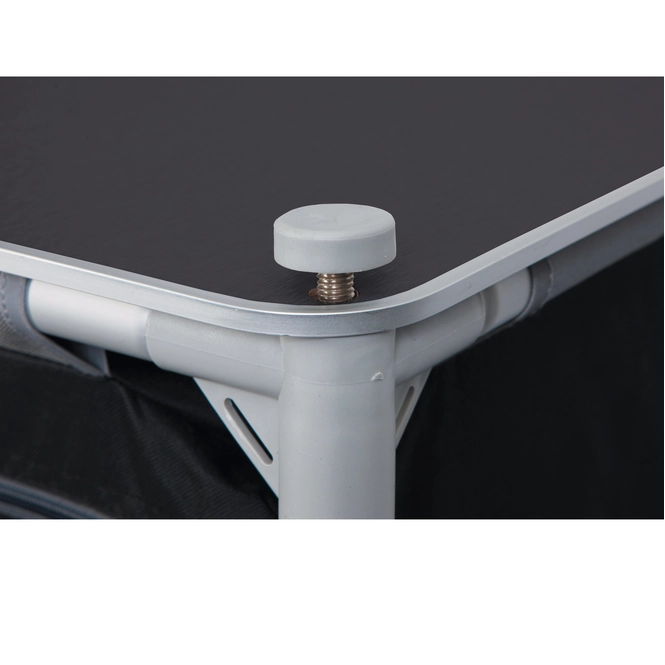 Diese luxuriöse Garderobe stammt von der führenden Campingmarke Bo-Camp. Sie hat 4 stabile Einlegeböden und 2 Seitentaschen. Dazu ist sie mit einem luxuriösen 2-farbigen 600D-Polyesterbezug und einer Stützfolie ausgestattet. Die verstellbaren Beine können getrennt voneinander verstellt werden. Dadurch steht die Garderobe auf jedem Untergrund stabil. Sie wird in einer Tragetasche geliefert, sodass sie leicht zu transportieren ist. Perfekt für den Urlaub!