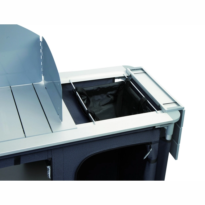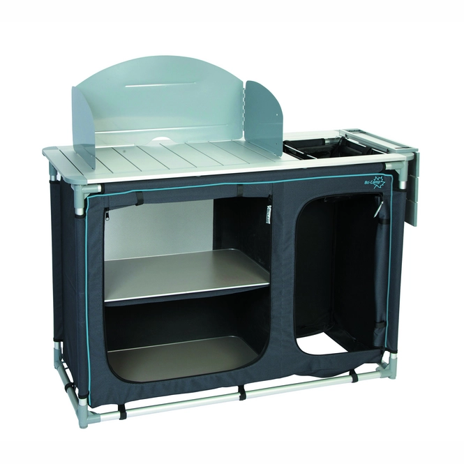 Diese sehr luxuriöse Kochinsel hat eine Spüle und stammt von der Marke Bo-Camp. Die Maße betragen 117 x 50 x 80 Zentimeter und die Kochinsel hat eine extra stabile 600-Denier-Polyesterabdeckung mit 2 praktischen Ablagen. Zusätzlich befindet sich auf der rechten Seite eine Öffnung mit einer Gasflasche. Die Oberseite dieser Kochinsel ist wasserdicht, hitzebeständig und mit einem Windschutz ausgestattet. Es ist für einen 4-Flammen-Gasherd geeignet. Die separat verstellbaren Beine sorgen dafür, dass die Kochinsel auf jedem Untergrund stabil steht. Kommt in einer Tragetasche. Gefaltet (L x B x H): 121 x 41 x 41 Zentimeter.