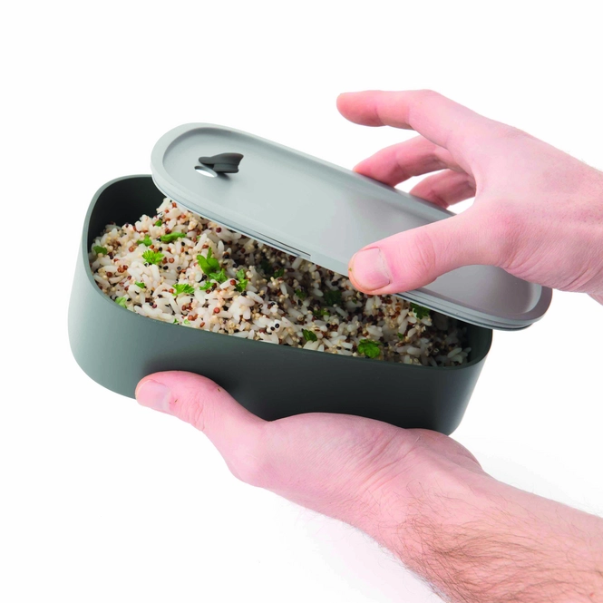 Die Lunchbox Duo stammt aus der Leo Line Kollektion der Qualitätsmarke BergHOFF. Sie hat ein schlankes Design und ein schönes mintgrünes Gummiband, um die Teile zusammenzuhalten. Dadurch eignet sich die Lunchbox sehr gut zum Mitnehmen zur Arbeit oder zur Schule. Die graue Farbe lässt Ihre Speisen zudem frisch und lecker aussehen. Die Brotdose ist luftdicht verschlossen, sodass Ihr Essen schmackhaft bleibt und der Geruch erhalten bleibt. Außerdem ist die Brotdose für den Gefrierschrank und die Mikrowelle geeignet.